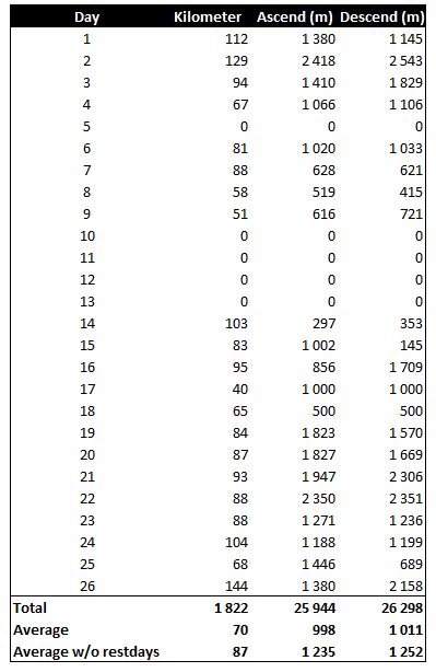I made the math of the distance covered – it was some 1,820 kilometers in 26 days (five of these without riding) and close to 26,000 meters of altitude gain and loss. (I actually believe it was somewhat more kilometers, as I did not count the distance covered within the cities, riding to and from the train stations, to the stores, etc. – so the true figure is closer to 2,000 km).