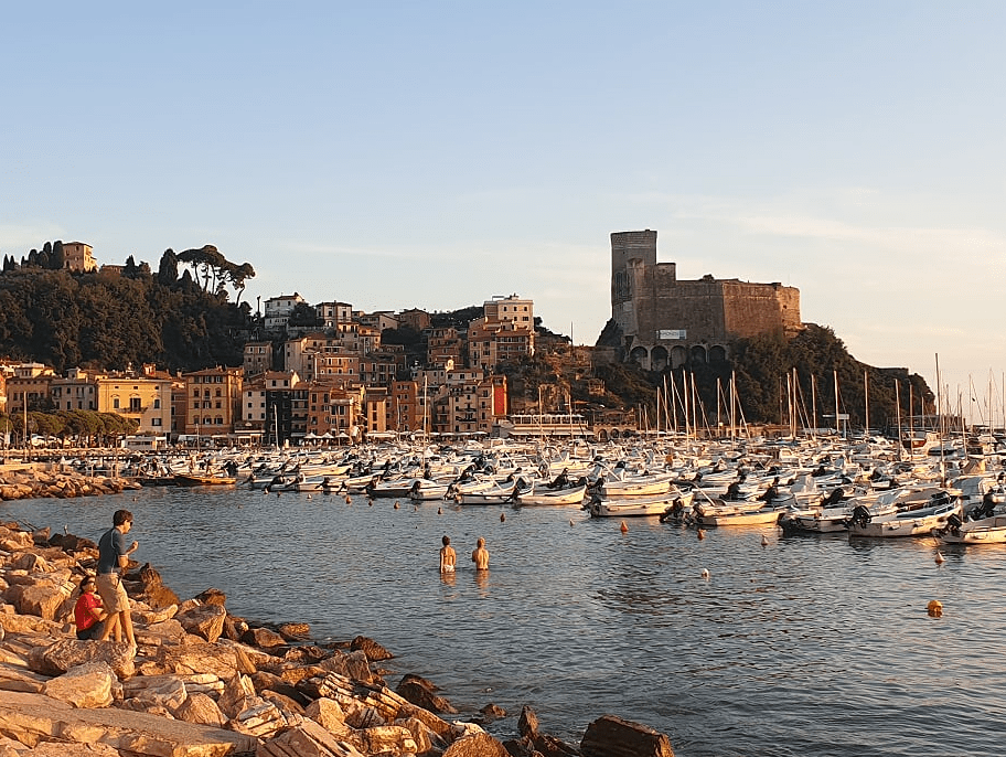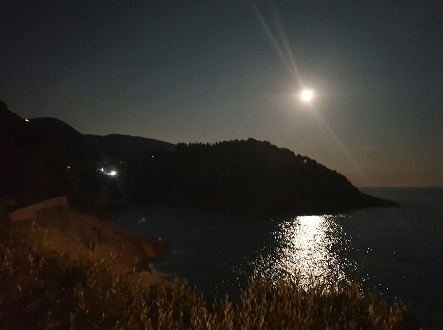 I was told there would be a campground to the east. I found one, they did allow tents, just camping cars – the next one was rather far, in the next town, in Lerici. Finally, I spotted the blue of the sea. Despite it being close to 8 in the evening, quite a few people were swimming. I would have loved to join them, but still had no place to stay. There was quite a climb over a hill to get to a small camping site – and I got lucky, they let me stay for the night (a few minutes after I arrived, people were already being turned away). The camp was in a bay, I was warned that water could be rough, that got me going! I pitched my tent and went in for one of the most exciting and refreshing swims in a long time, with the bay gleaming in shine of the full moon. No wolves that night…