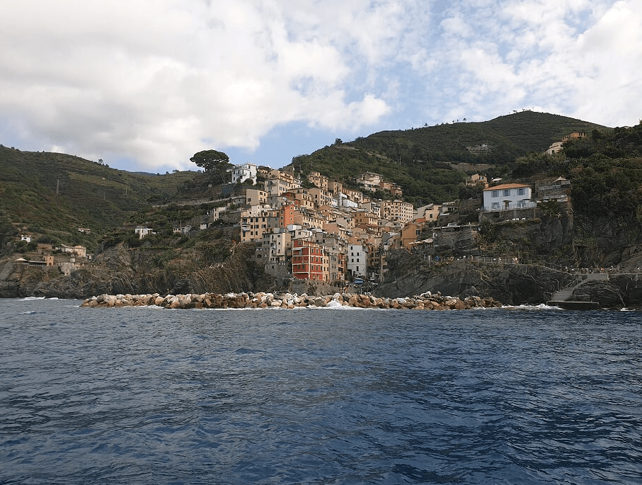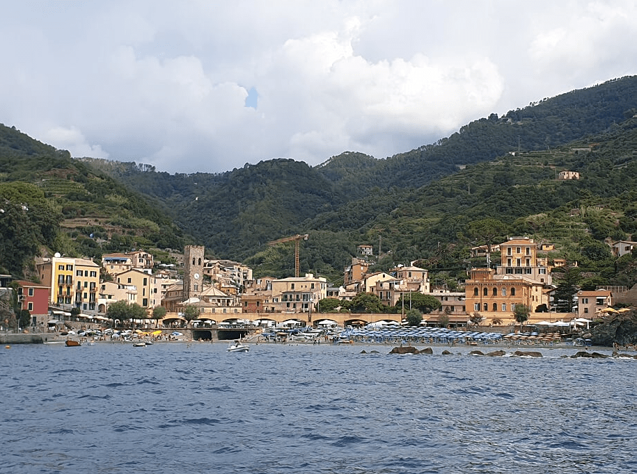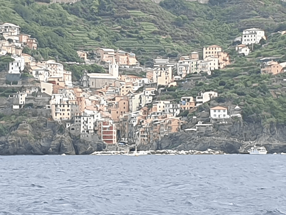 Now at La Spezia begins Cinque Terre. I have covered this by bike on an earlier trip of Tuscany, I remembered the steep hills, where the small, colorful villages are at the seafront, with winding switchbacks leading to these, the main road running at a considerable altitude. What the heck, I had already “cheated” on this trip by taking a train from Triest to Venice and from there to Verona: I decided on taking a ship through Cinque Terre and exploring it from the water. A benefit was that some of the ships left right from Lerici, the town I was staying at, so I did not have to backtrack to La Spezia (which wasn’t one of my favorite towns). I crossed the hill from the campground to the center of town (that I rode on the previous night), bought a ticket just after the booth had opened, purchased a large breakfast from a local Coop and boarded with my bike for a 9:30 departure, bound in a westerly direction towards Monterosso, with four other stops (Porto Venere, Riomaggiore, Manarola and Vernazza). In a nutshell, it was a beautiful trip, as one of the first ones to board, I had a great seat on the deck and just like a Japanese tourist, (sorry…), snapped away my camera every minute. Here is a small selection.
