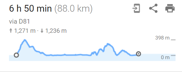 Here is the map for the day, It was roughly 90 kilometers, with 1300 meters of elevation gain and loss. I actually felt it to be double, but the facts are facts. This is probably because the beginning of the day was steep, then it was flat for a long time, followed by the roller-coaster .