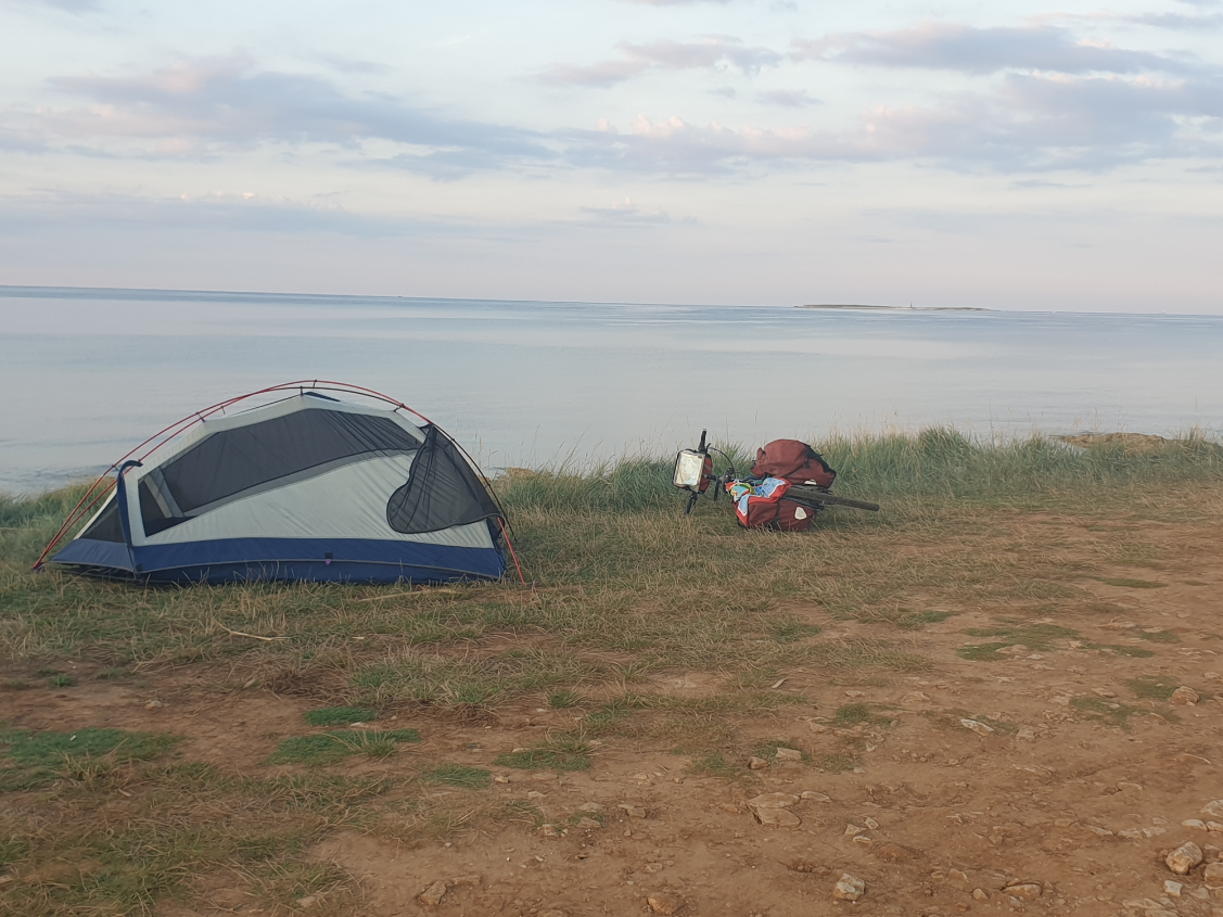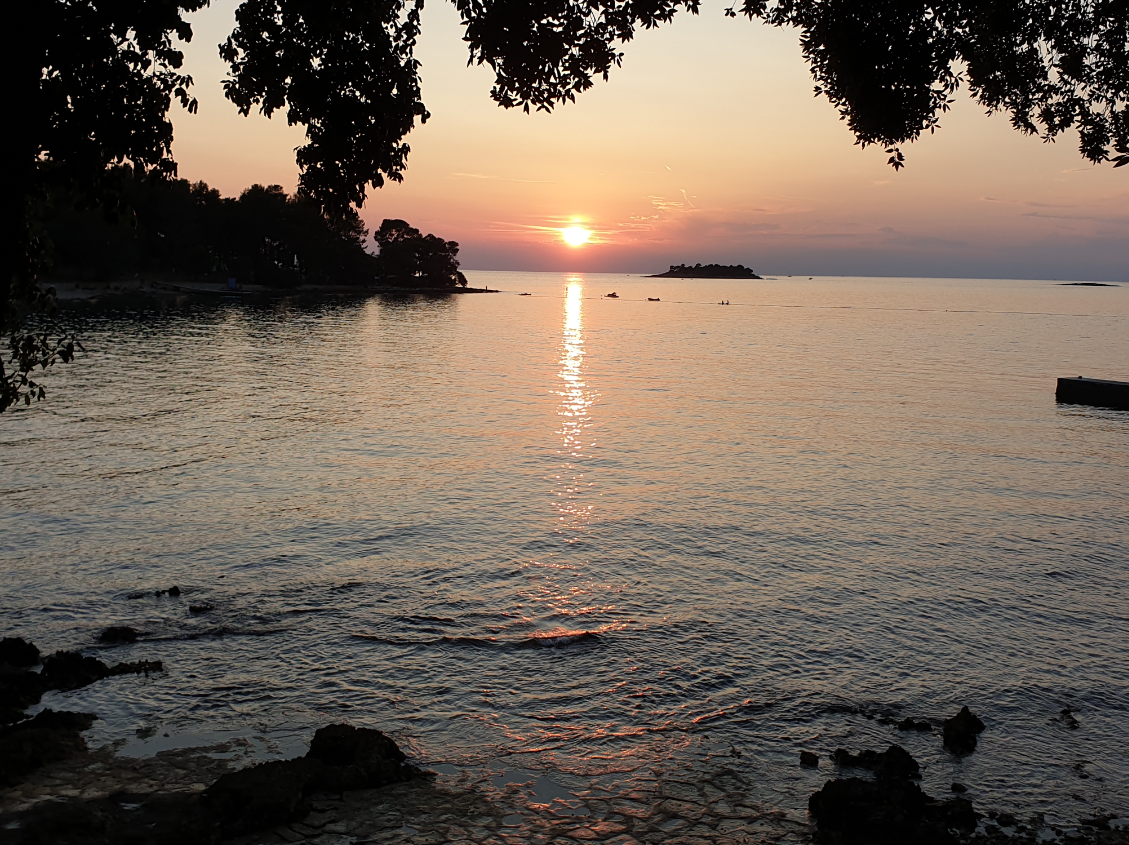 I took a rest at a supermarket I had stopped on an earlier route, then I stopped at a campground on the other side of the Limski canal, close to the city of Vrsar. I pitched my tent on a small island in the camping. I was happy to watch a beautiful sunset.