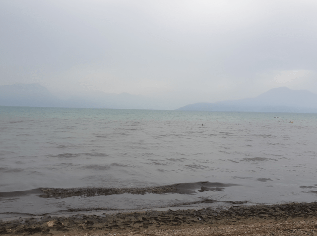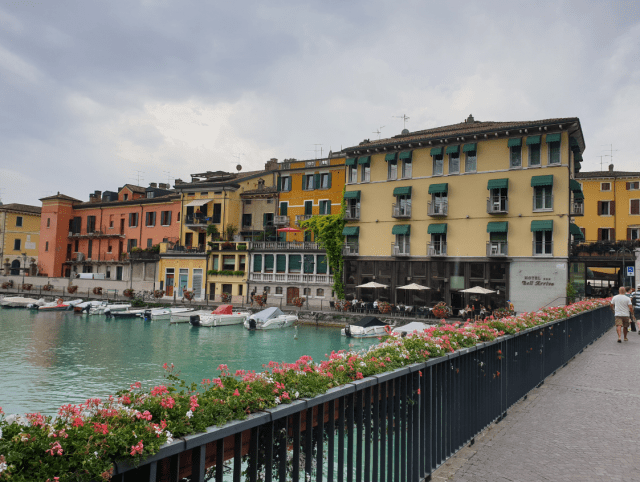 I purchased some food at a store and managed to find a large tent, set up for some concert or show, where I had my lunch – this stopped me from getting wet, and by the time I had finished eating, the rain stopped – time to move on. Due to the gloomy weather, there were not too many people on the shore, so for a while, I rode on the pedestrian path right next to the lake, where biking is not allowed, but no one seemed to care or if they did, I did not notice (and I could not have cared less…). I made to the southwestern edge of the lake, to another pretty town, with somewhat less tourists, called Desenzano.